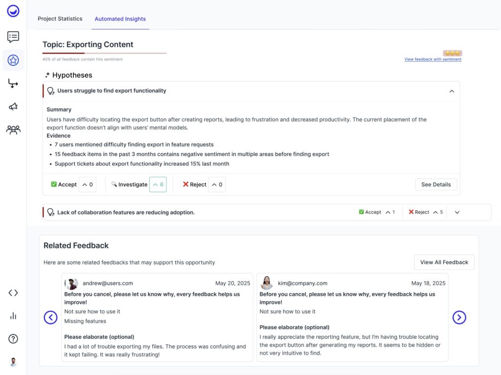 Our built-in transparency ensures you can trace every insight back to its original feedback source. No more guessing what the AI assumed, you can always access the real user comments behind the analysis to uncover the true root causes.