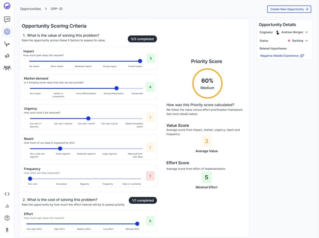 Another standout feature is our prescriptive scoring system, designed to help you ask the right strategic questions: What’s the impact? How strong is market demand? How urgent or frequent is this problem for users? While frameworks like ICE or RICE focus on surface-level metrics, ours helps you think about what truly drives value.