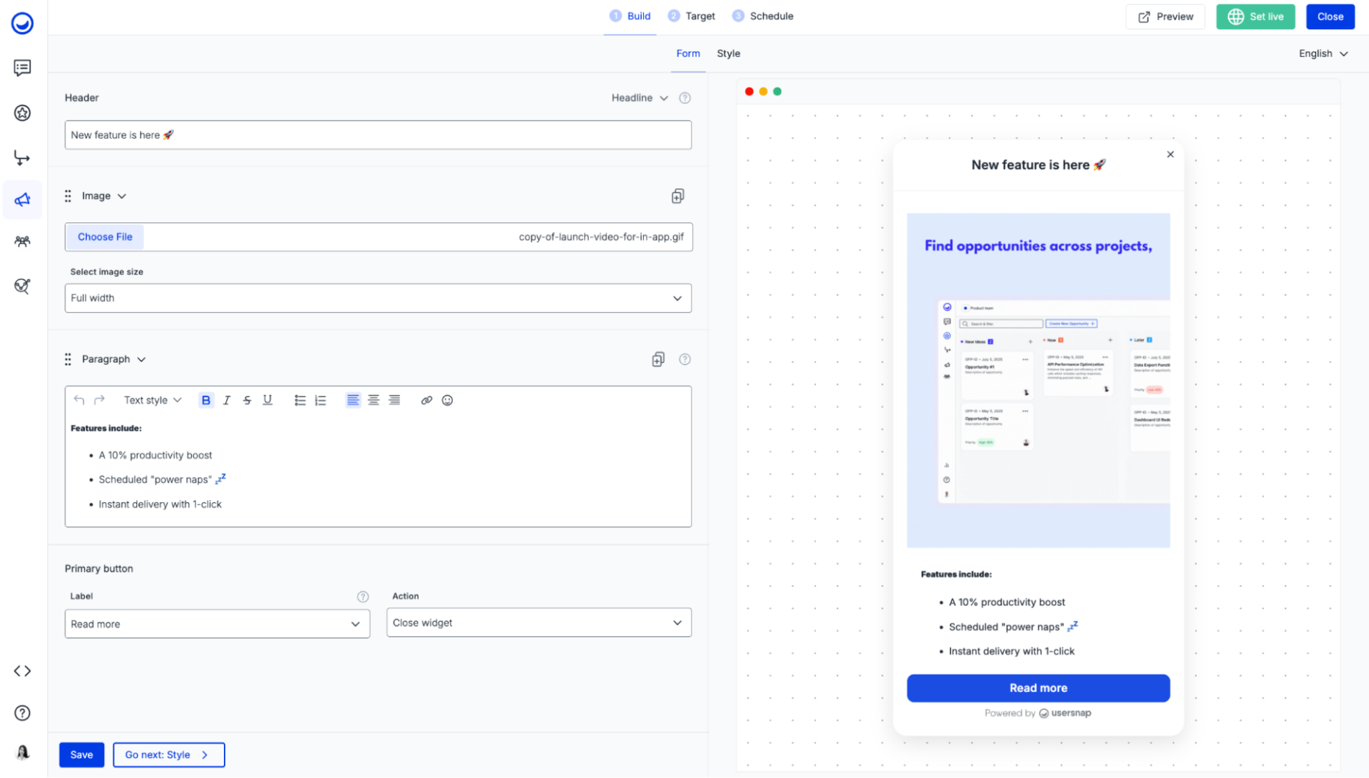 The final, and often most impactful, step in your PDLC is closing the loop with your users. With announcement popups, changelog, and feedback email replies, Usersnap offers a variety of creative ways to keep your users informed about new releases and updates.
