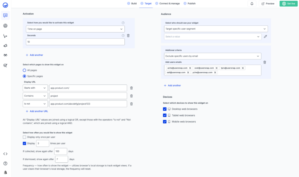 Customers love Usersnap’s in-the-moment surveys and rich feedback capture. To provide your research with even more flexibility, we’ve enhanced multi-criteria segmentation so you can target users by custom attributes from your app, CRM, or feedback activity. This update helps you reach the right users at the right time, enabling deeper, more focused product discovery.