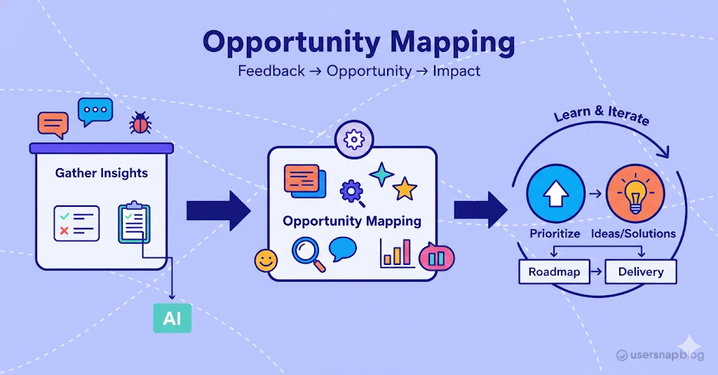 Opportunity mapping helps teams transform customer problems into tangible product opportunities. Instead of immediately building features, teams pause to identify unmet needs, group related pain points, and determine which problems truly matter. Usersnap streamlines this process — it collects feedback in one place and automatically highlights common themes, allowing product teams to quickly spot real opportunities.