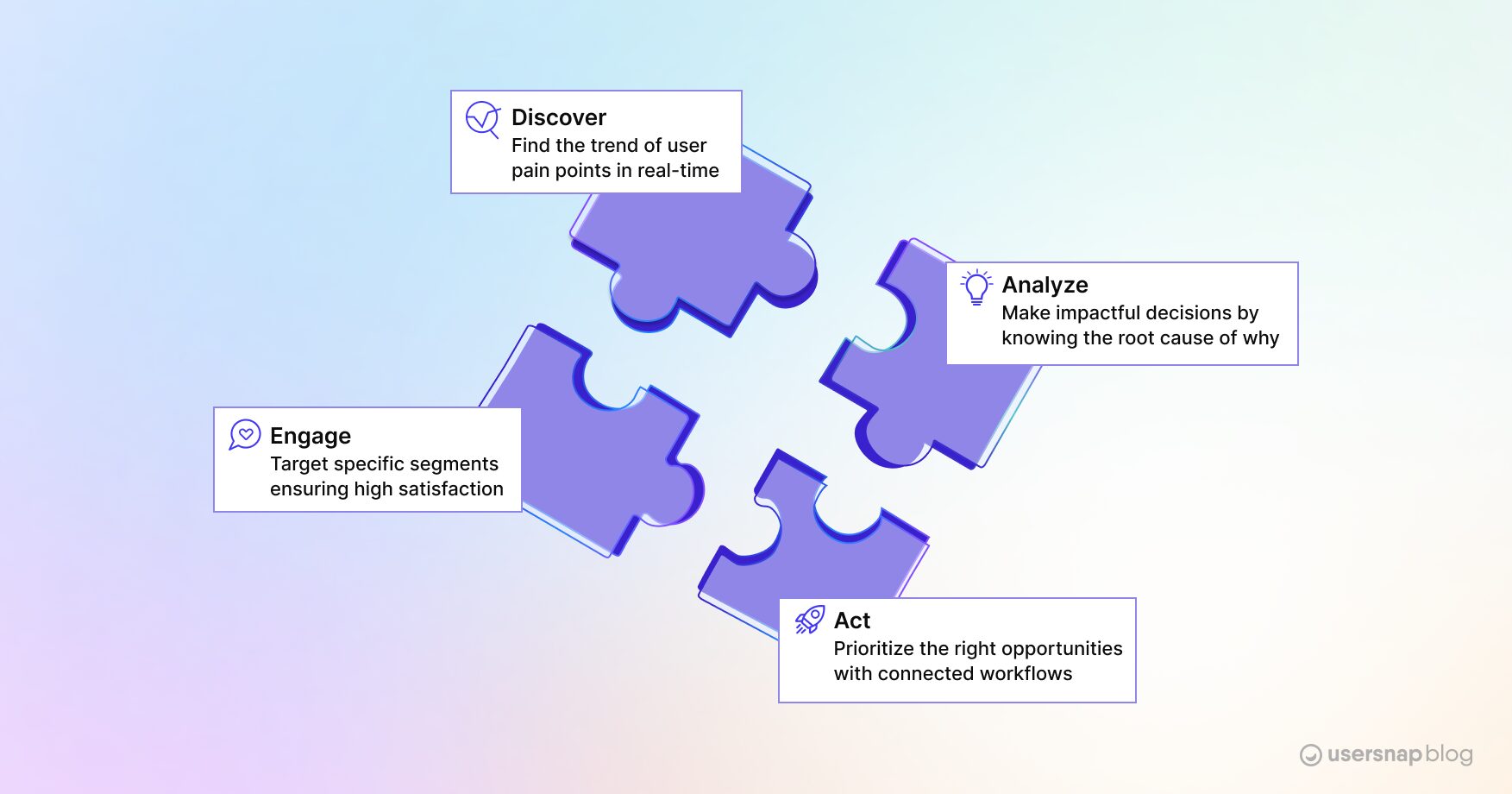 Let’s dive into how the new Usersnap filters the noise and amplifies the product signals that matter. It breaks down into four critical phases: Discover, Analyze, Act, and Engage.