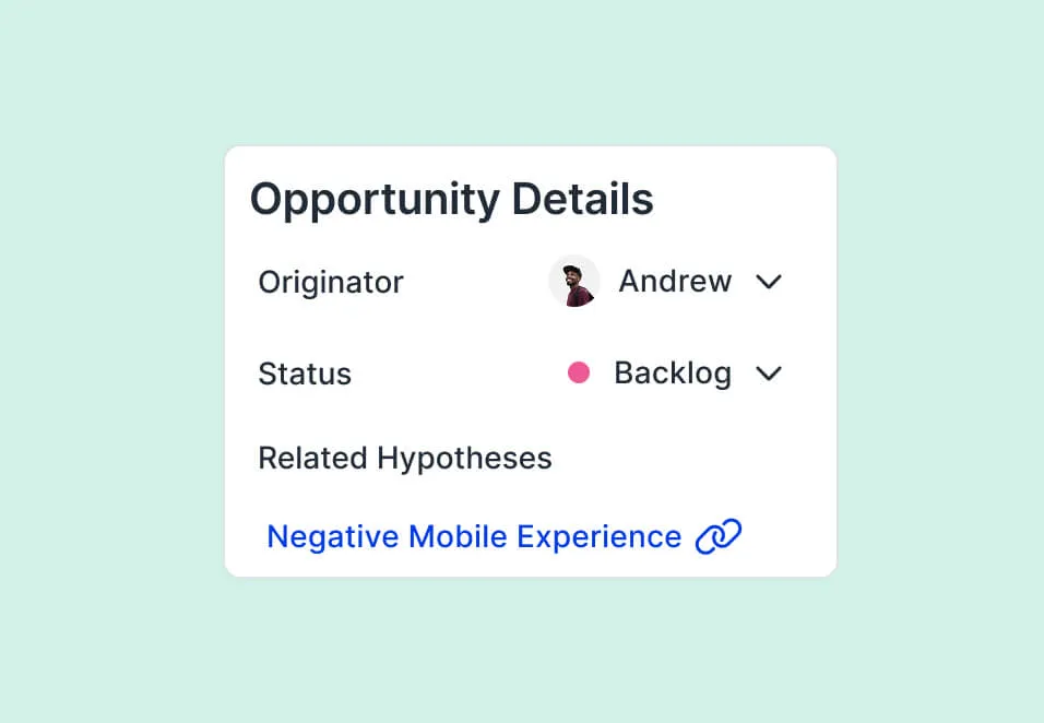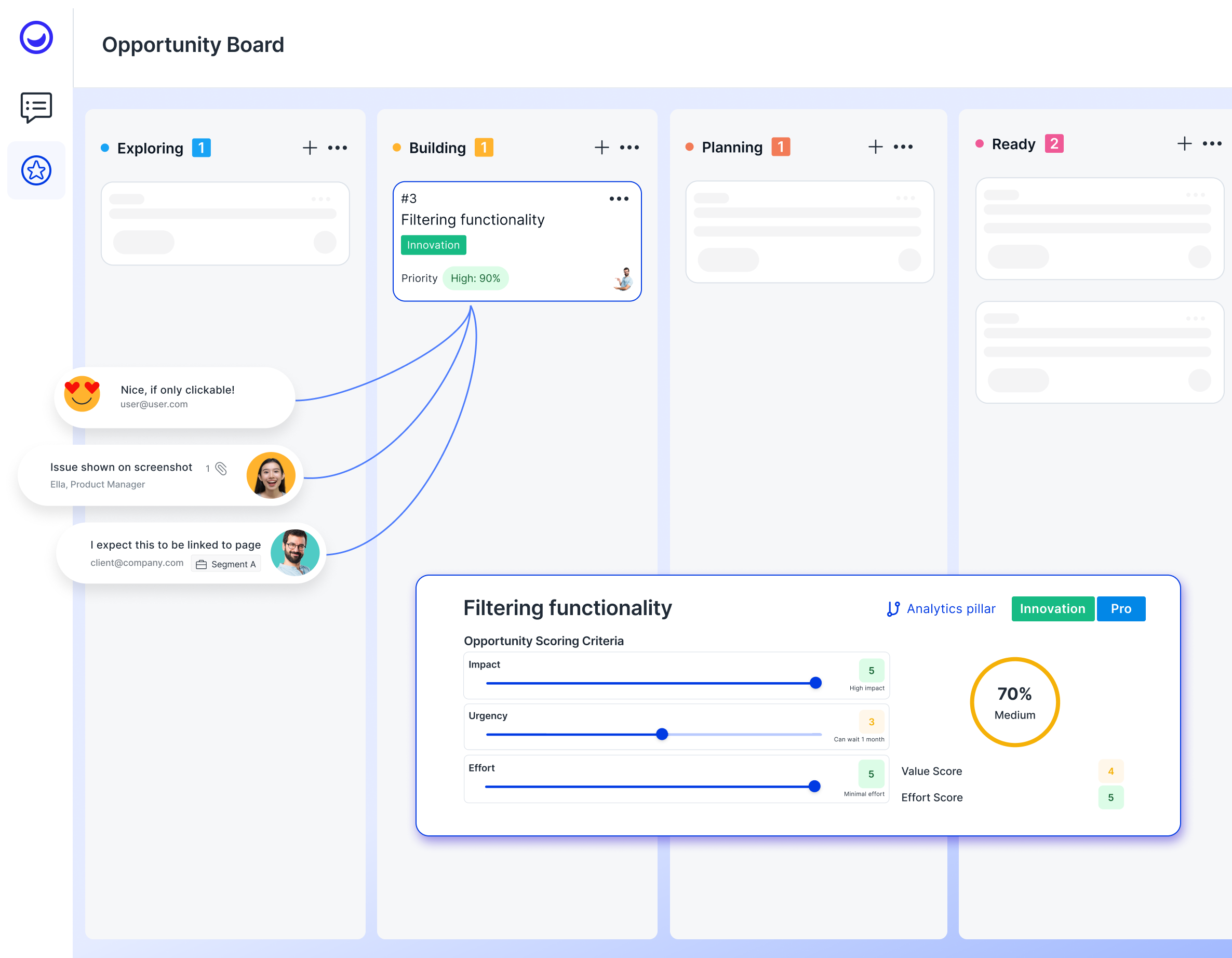 Complete visibility into user feedback, hypotheses, and opportunity scoring. Drive alignment and focused planning through clear, contextual, actionable insights.