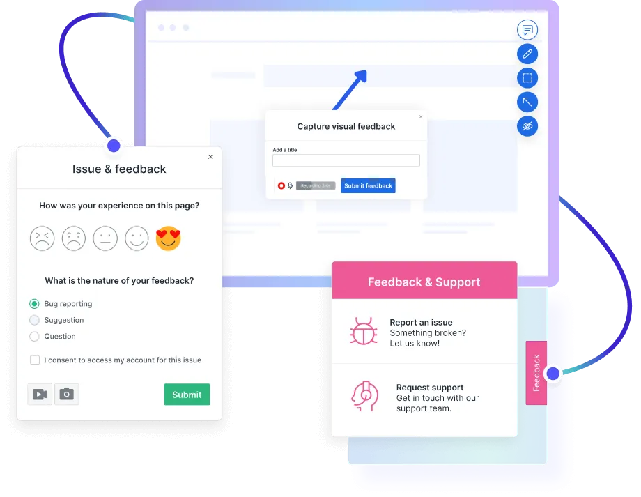 Send feedback in the rich format of screenshots with annotations, screen recording with voice over, feedback forms connected directly to Jira, and more! Metadata and console log errors automatically attached.
